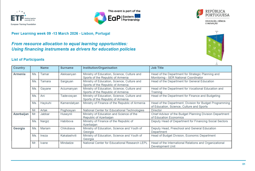 A carta transmite os sinceros agradecimentos da ETF pelo tempo, pela expertise e pela abertura demonstrados pelos nossos representantes, que partilharam conhecimentos e experiências com as delegações dos Países Parceiros Orientais e com a equipa da ETF.
